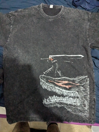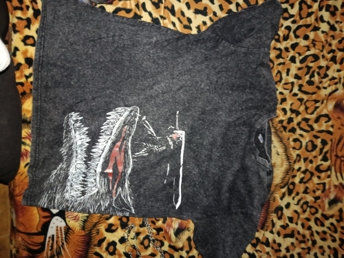 Shirt is a little bit lighter color than on pictures (more grayish than blackish), print is good and textile quality looks really good. Hope it doesn’t shrink to much when washing lol 😉 i am 183 cm tall and i ordered m – it fits perfectly! Recommend!
